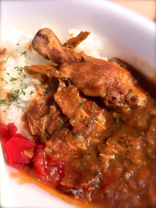 じっくりと煮込んである骨付きチキンが柔らかくてジューシーなチキンカレー!